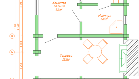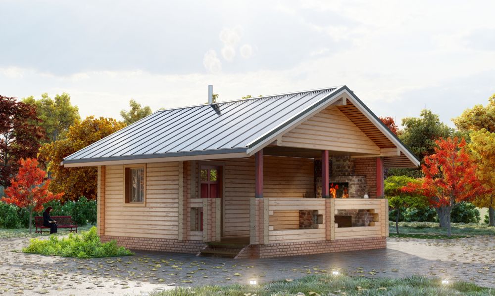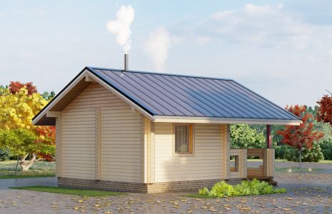 Баня из профилированного бруса с комнатой отдыха, парной и мойкой. Проектом также предусмотрено размещение зоны барбекю на террасе. Архитектурно баня близка к стилю «Шале», который включает в себя большие свесы кровли, видимые балки и консоли, поэтому идеально впишется в горную местность рядом с домом-шале.